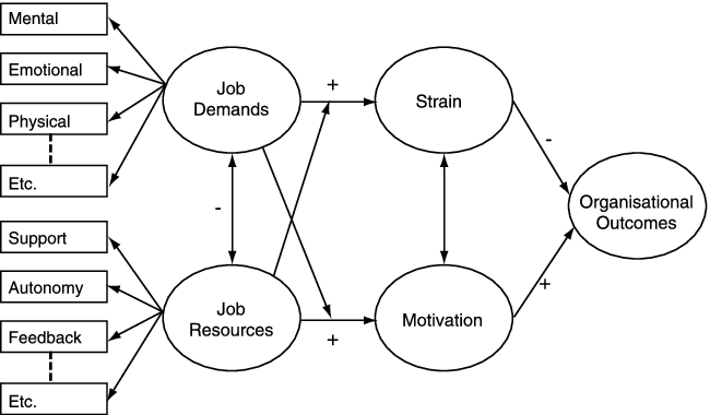 Het model maakt onderscheid tussen taakeisen (job demands) en hulpbronnen (job resources).